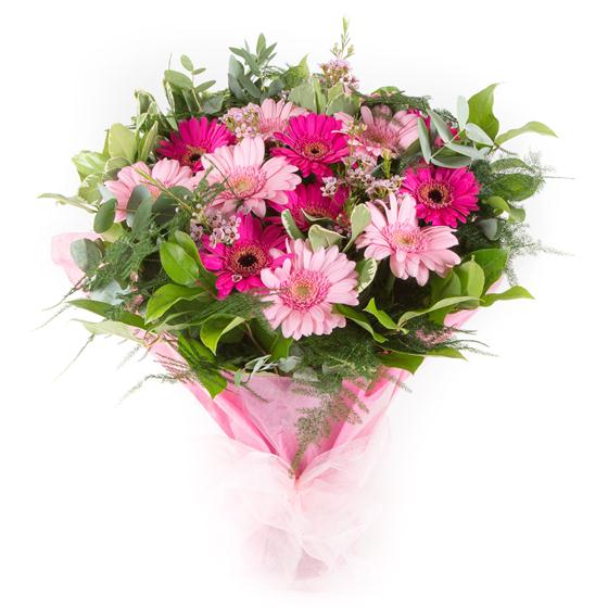 A hand-tied bouquet of cerise and baby pink gerberas accompanied by a selection of mixed foliage.